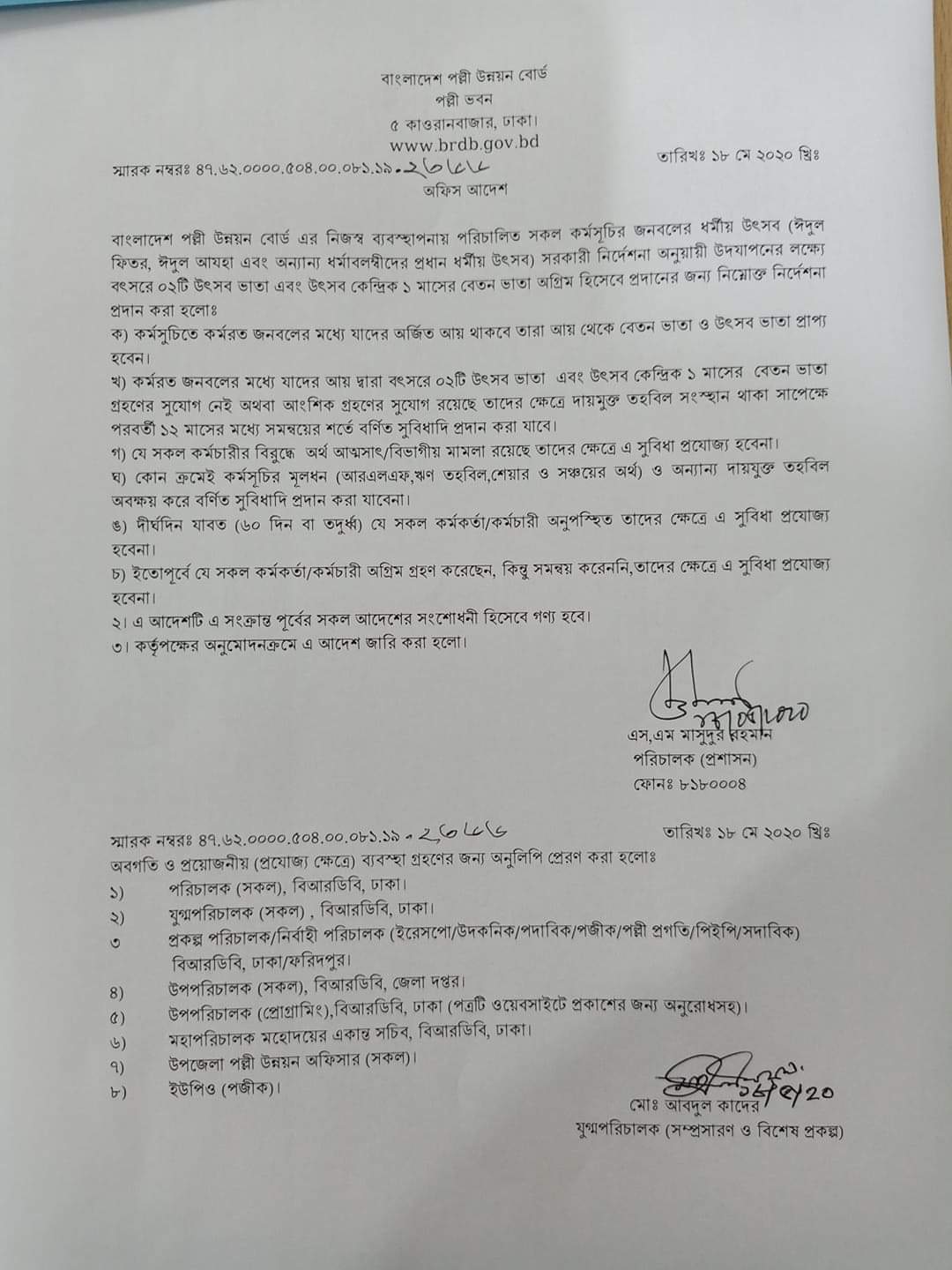Home / News / Archive / ধর্মীয় উৎসব/ঈদ বোনাস ও বেতন ভাতা অগ্রীম হিসেবে প্রদান সংক্রান্ত অফিস আদেশ, স্মারক নং- ২৩৬৬, তারিখঃ ১৮/০৫/২০২০ খ্রিঃ